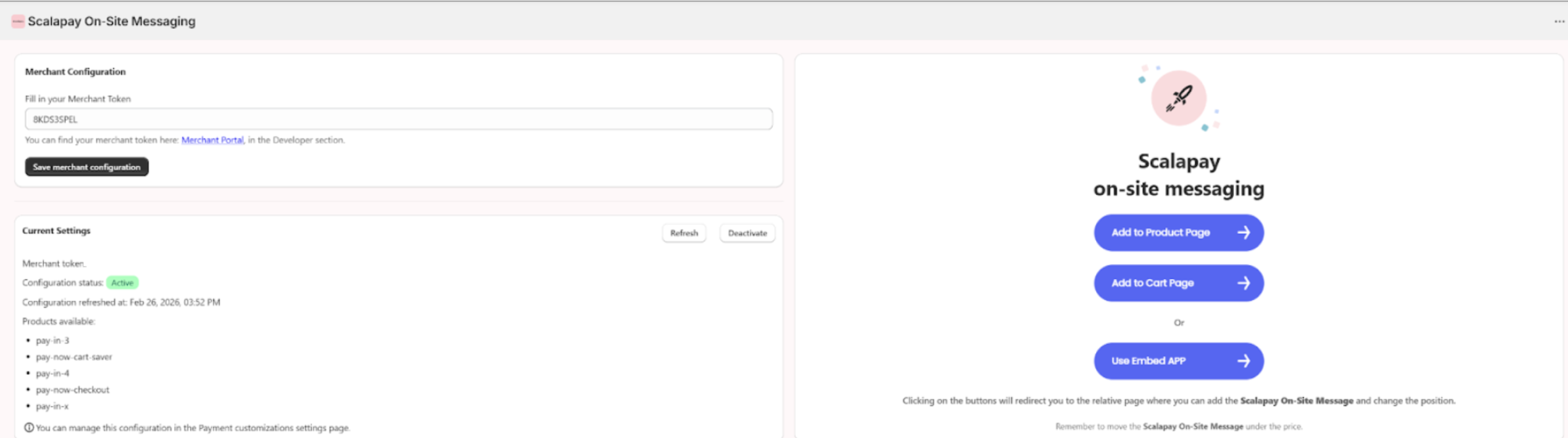 You will have to enter your Merchant token in the section Merchant Token in order to show your correct Scalapay products on the widget. You will find your Merchant token on your Scalapay Merchant Portal in the "Developer" section.