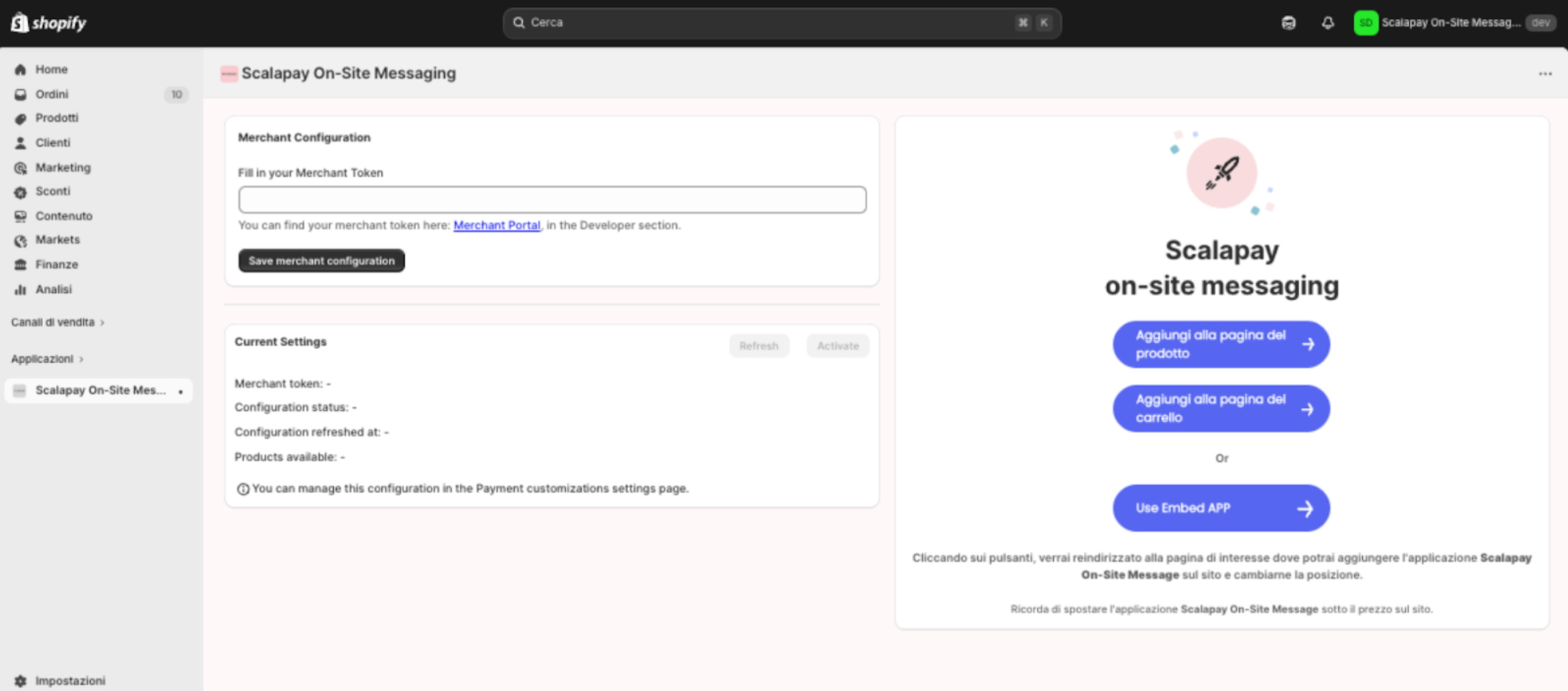 Go to the "Apps" section of your Shopify backend, click on it and type "Scalapay" in the search bar at the top of the page. Choose the result "On-Site Messaging" from the pop-up that will appear.