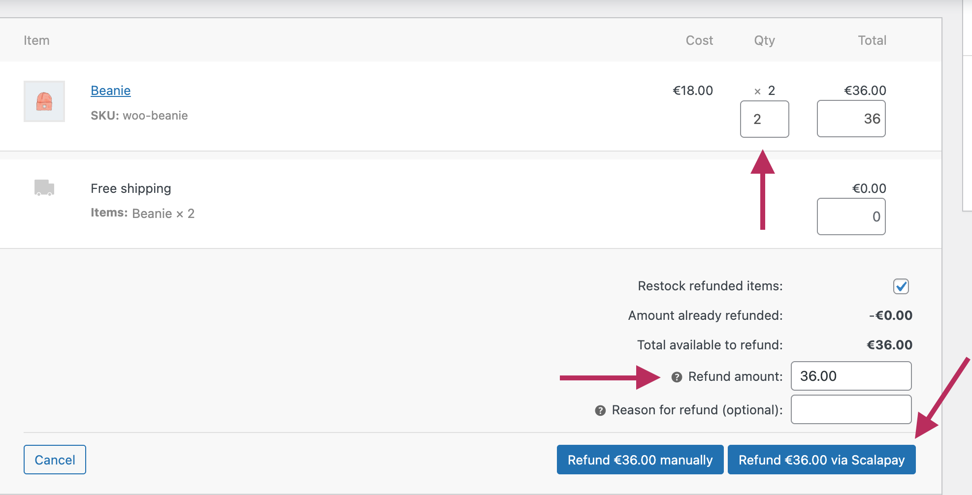 - After clicking Refund, a form will appear. Enter the quantity of items and the amount, then click Refund via Scalapay.